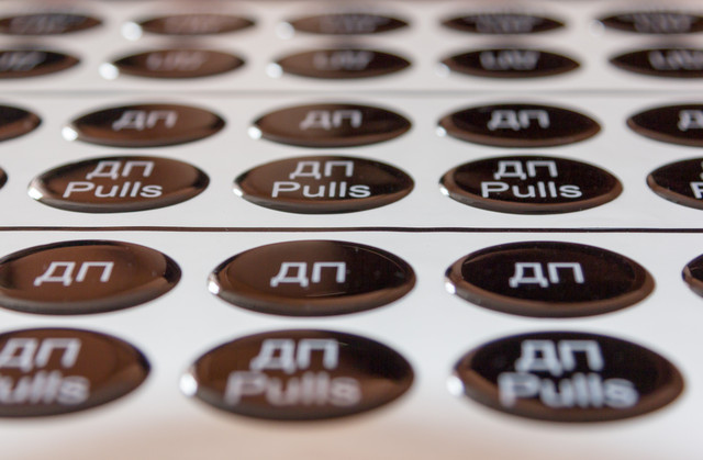 Після друку та порізування наклейка заливається спеціальною прозорою епоксидною смолою. Завдяки своїм оптичним характеристикам, після застигання смола утворює своєрідну глянсову лінзу, яка надає об'єм і глибину зображенню, роблячи початковий колір яскравішим і насиченішим.
